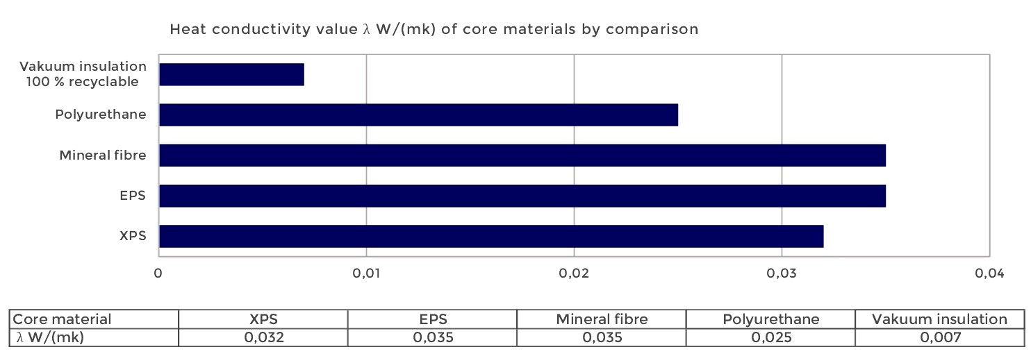 Core materials have different insulation characteristics due to varying heat conductivity values.